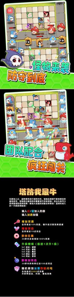 玩家加入红、蓝阵营来进行塔防对抗。怪物会源源不断地朝你的基地进攻,怪物抵达基地前你需要消灭这些怪物!送出礼物可以获得炮塔和各种效果!释放大范围的技能也有奇效!坚持时间久的一方将获得胜利!